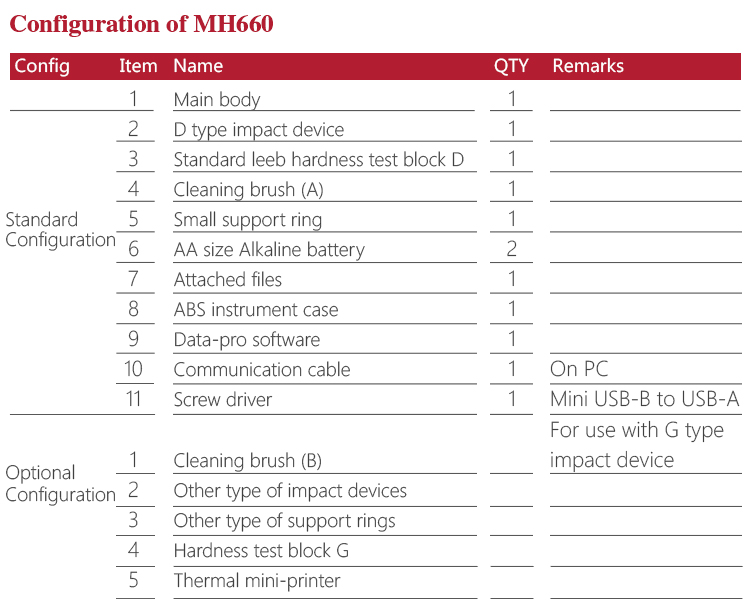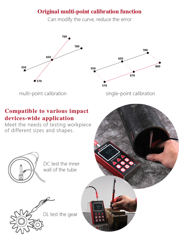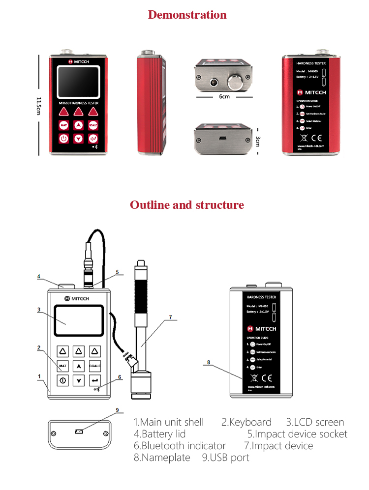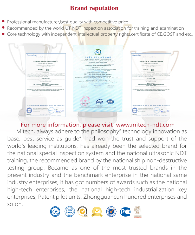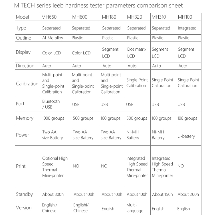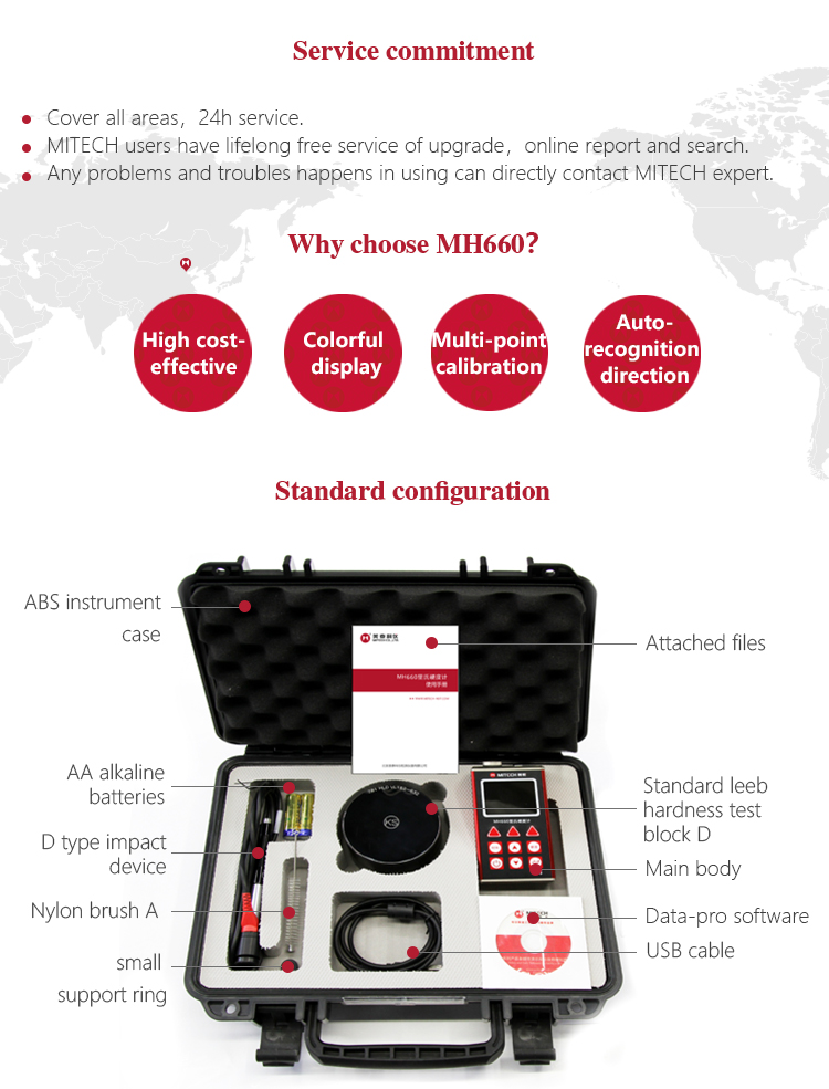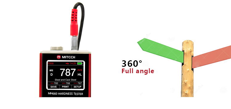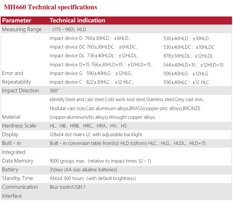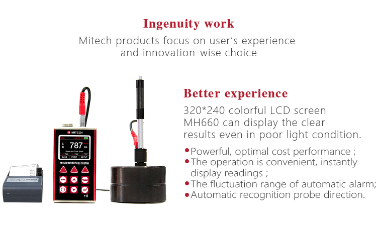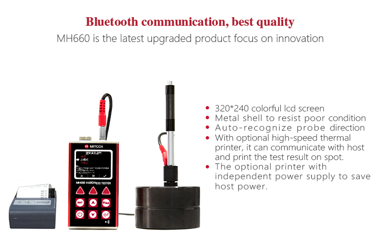 MH660 portable Leeb hardness tester is Mitech latest upgrade model, it focuses on user experience and innovative features. Using 320 × 240 color LCD display, can also present a clear measurement results in dim light and strong sunlight environment , greatly enhance the visual experience; sealed metal case compact design, smaller, better quality, designed to withstand harsh field environment of the oil, dust ,more original point calibration function is used to do  multi-point calibration for convert curve to reduce errors;during measurement instrument can automatically identify the measuring direction, automatically alarm when out of range,  to meet the inspection requirements with high precision and multi-angle material collected, support free conversion between hardness type; low-power design powered by two AA batteries,  support multiple languages.Blue-tooth printer. It is widely used in metal processing and manufacturing, special equipment or permanent component failure analysis in service, inspection and other fields. Particularly suitable for large non-removable part of the site hardness testing. It is to improve the pass rate of production and cost savings necessary professional precision instrument.