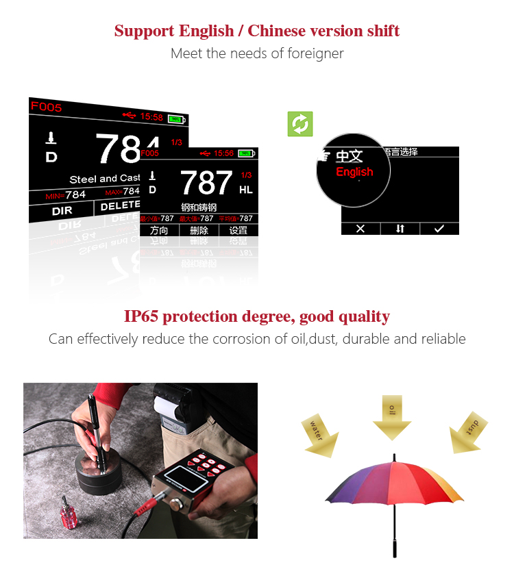 It can store 500 groups (impact times 32 ~ 1) hardness values, each data includes single testing value, average value, measurement date / time, impact direction, frequency, material, hardness and other information.