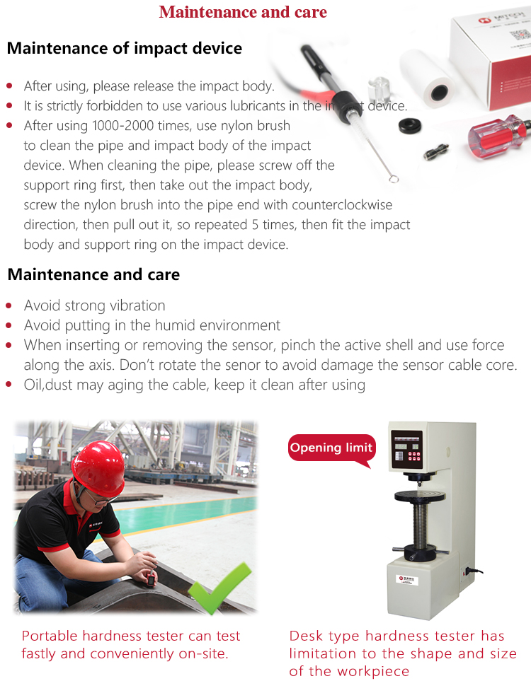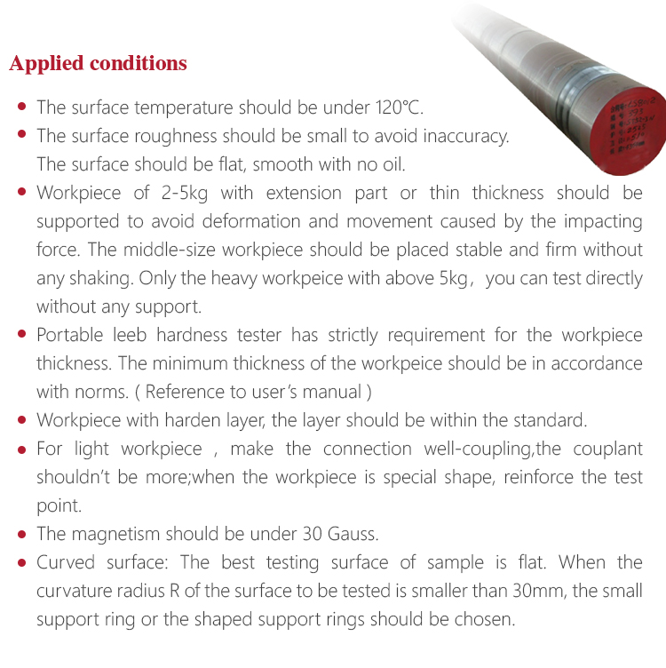 Main applications:car chassis hardness testing;the installed machinery and permanently assembled parts;rapid testing in large range and multi-measuring areas for large-scale work piece;failure analysis of pressure vessel, steam generator and other equipment;bearings and other parts;material identification in the warehouse of metallic materials;heat treatment workpiece of quality control;