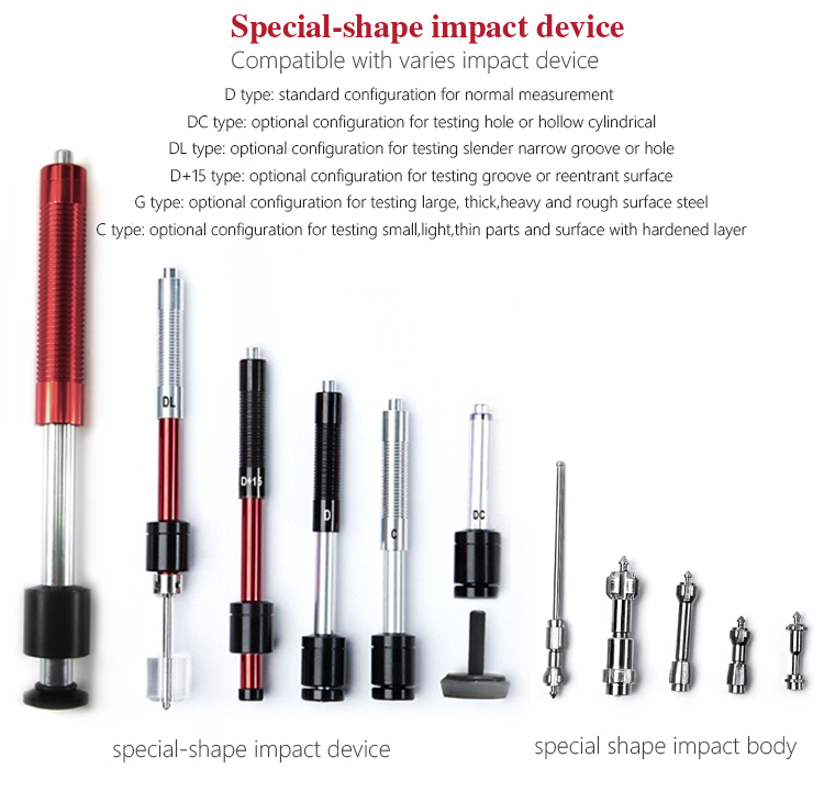 The DL type impact device of Mitech portable hardness tester, height 204mm, weight 50g, diameter 20mm, has build-in DL impact body, front side is slim device, it is suitable for hardness measurement of the narrow parts (like holes, slits) of the workpiece with weight above 5kg, thickness above 5mm. It is widely used for the narrow part of the installed machinery or permanently assembled parts, rapidly testing for multiple measuring parts in large range of the large-scale workpiece, hardness testing for gear tooth root and other slender narrow grooves or hole. It can realize the precise measurements for Leeb, Brinell, Rockwell and others.