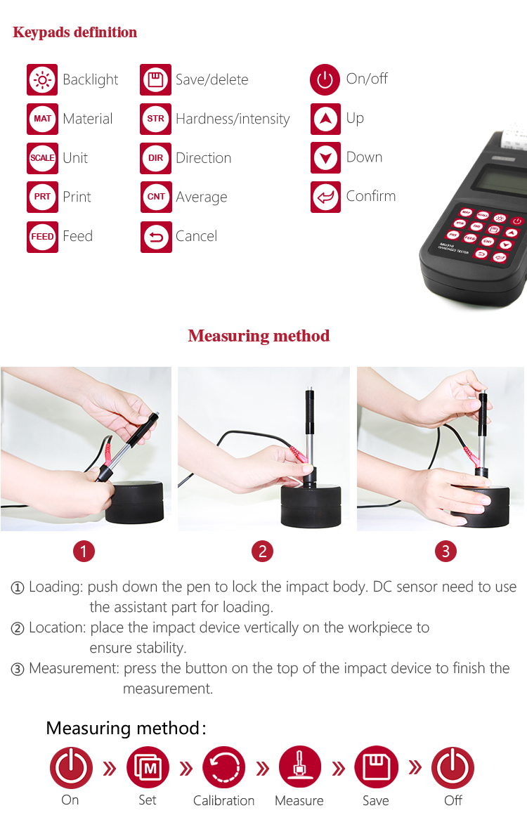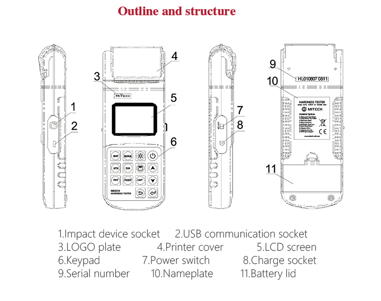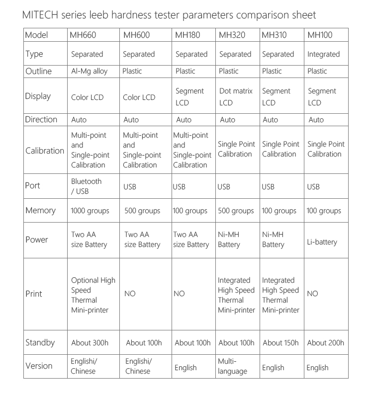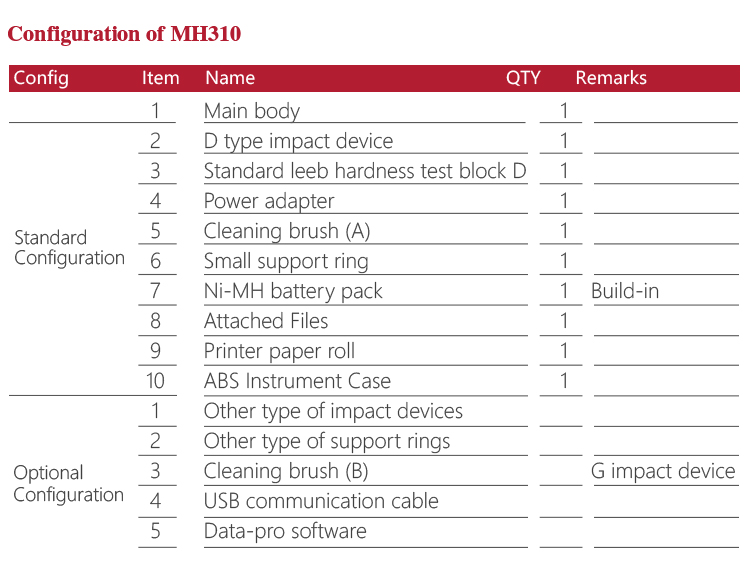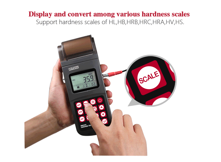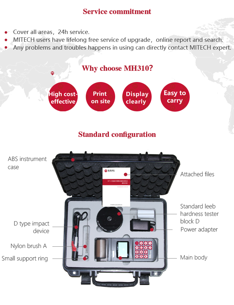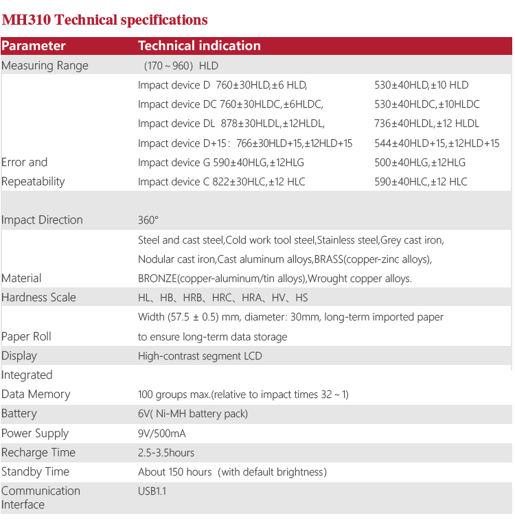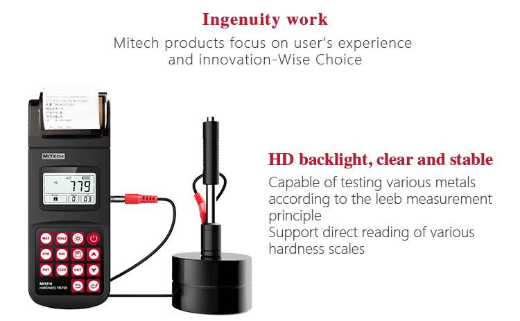 MH310 portable Leeb hardness tester, based on Leeb hardness measuring principle, quick and easy on-site test the hardness of series metal materials, support free conversion between Leeb, Brinell, Rockwell hardness scale and others,It uses high-contrast  segment LCD to display clear ,stable performance. integrated high-speed thermal printer ,which can print on-site measurements. It is widely used in annealing, tempering, quenching , quality control for the work piece; hardness testing for machine tool and automobile chassis ; on-site hardness testing of in-service non-removable parts ; quality testing for hardware, forging, machine tools and special steels; quality control for batch production process and so on.Good quality and effective cost ,which is a wise choice for regular need of hardness testing .