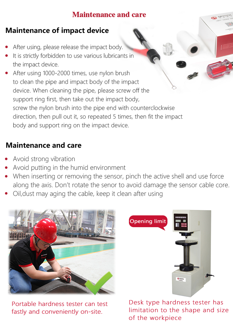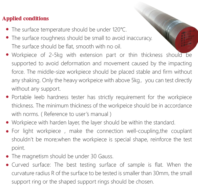 Main applications:car chassis hardness testing;the installed machinery and permanently assembled parts;rapid testing in large range and multi-measuring areas for large-scale work piece;failure analysis of pressure vessel, steam generator and other equipment;bearings and other parts;material identification in the warehouse of metallic materials;heat treatment workpiece of quality control;