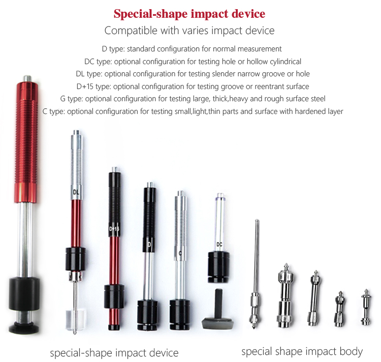 The DL type impact device of Mitech portable hardness tester, height 204mm, weight 50g, diameter 20mm, has build-in DL impact body, front side is slim device, it is suitable for hardness measurement of the narrow parts (like holes, slits) of the workpiece with weight above 5kg, thickness above 5mm. It is widely used for the narrow part of the installed machinery or permanently assembled parts, rapidly testing for multiple measuring parts in large range of the large-scale workpiece, hardness testing for gear tooth root and other slender narrow grooves or hole. It can realize the precise measurements for Leeb, Brinell, Rockwell and others.