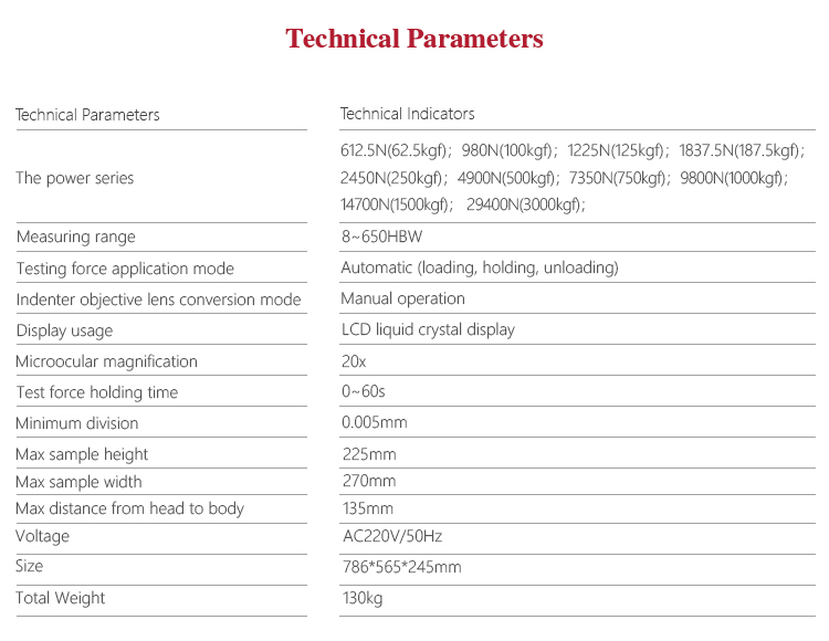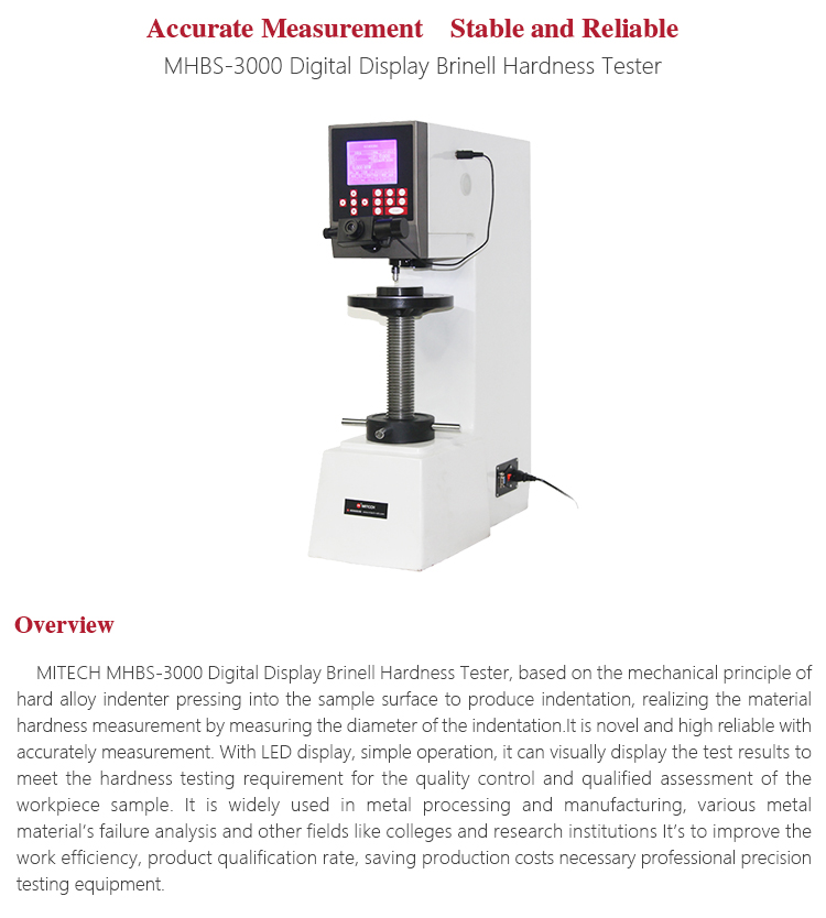 MITECH MHBS-3000 Digital Display Brinell Hardness Tester, based on the mechanical principle of hard alloy indenter pressing into the sample surface to produce indentation, realizing the material hardness measurement by measuring the diameter of the indentation.It is novel and high reliable with accurately measurement. With LED display, simple operation, it can visually display the test results to meet the hardness testing requirement for the quality control and qualified assessment of the workpiece sample. It is widely used in metal processing and manufacturing, various metal material’s failure analysis and other fields like colleges and research institutions It’s to improve the work efficiency, product qualification rate, saving production costs necessary professional precision testing equipment.