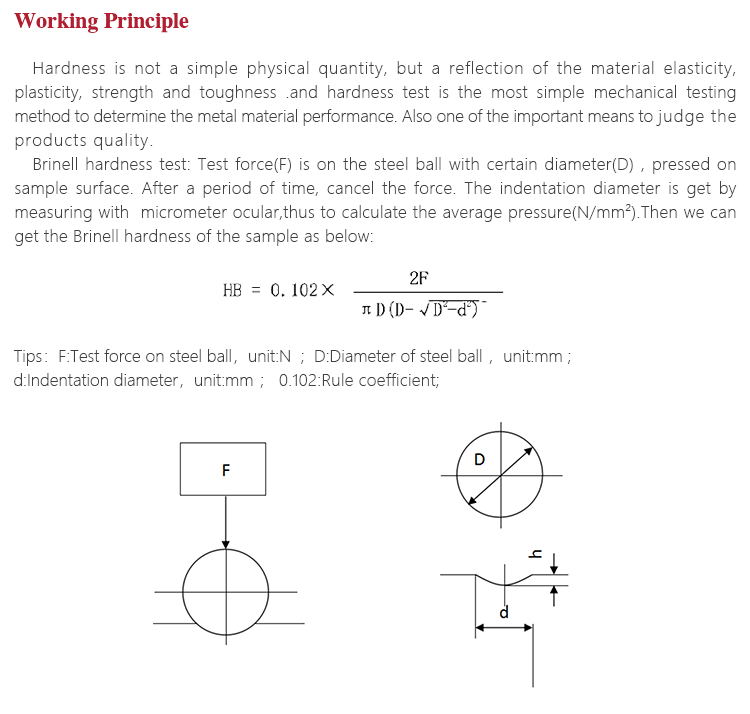 Brinell hardness test: Test force(F) is on the steel ball with certain diameter(D) , pressed on sample surface. After a period of time, cancel the force. The indentation diameter is get by measuring with  micrometer ocular,thus to calculate the average pressure(N/mm2).