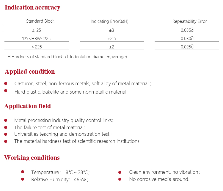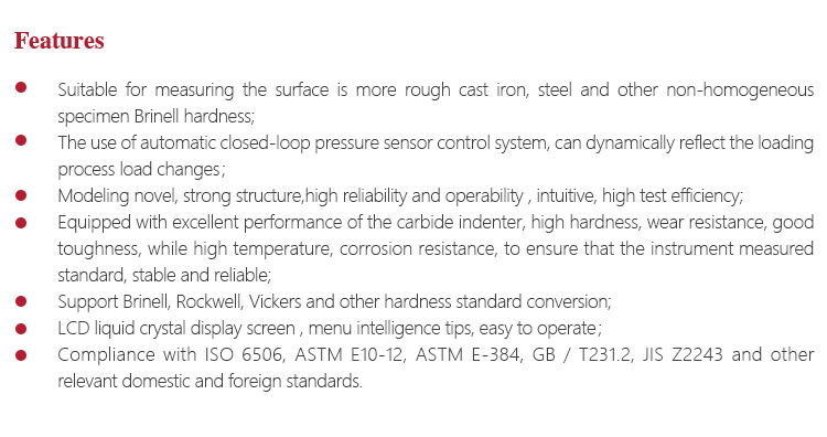 Suitable for measuring the surface is more rough cast iron, steel and other non-homogeneous specimen Brinell hardness;