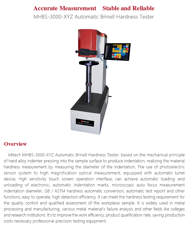Mitech MHBS-3000-XYZ Automatic Brinell Hardness Tester, based on the mechanical principle of hard alloy indenter pressing into the sample surface to produce indentation, realizing the material hardness measurement by measuring the diameter of the indentation, The use of photoelectric sensor system to high magnification optical measurement, equipped with automatic turret device, high sensitivity touch screen operation interface, can achieve automatic loading and unloading of electronic, automatic indentation marks, microscopic auto focus measurement indentation diameter, GB / ASTM hardness automatic conversion, automatic test report and other functions, easy to operate, high detection efficiency. It can meet the hardness testing requirement for the quality control and qualified assessment of the workpiece sample. It is widely used in metal processing and manufacturing, various metal material’s failure analysis and other fields like colleges and research institutions. It’s to improve the work efficiency, product qualification rate, saving production costs necessary professional precision testing equipment.