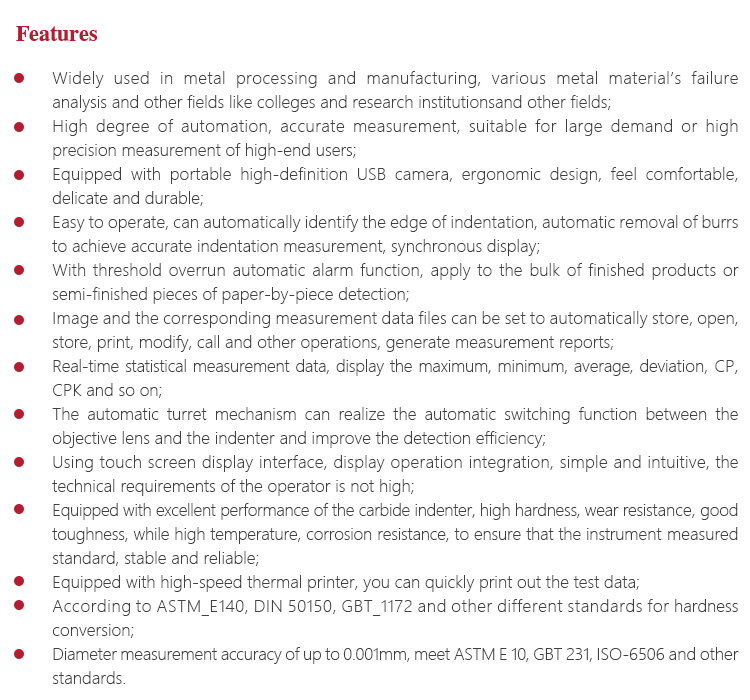 Diameter measurement accuracy of up to 0.001mm, meet ASTM E 10, GBT 231, ISO-6506 and other standards;
