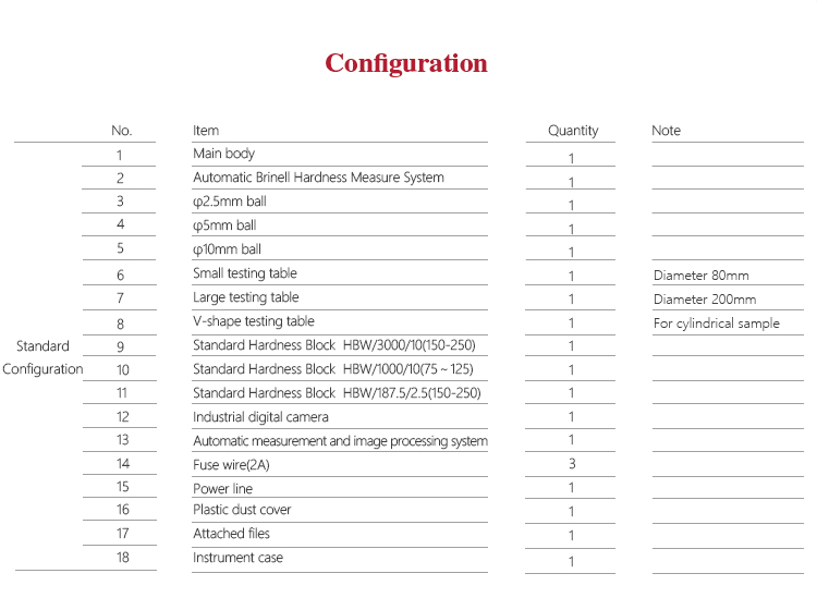 Brinell scale HBW2.5/62.5、HBW2.5/187.5、HBW5/125、HBW5/250、 HBW5/750、HBW10/100、HBW10/1500、HBW10/3000、 HBW10/250、HBW1