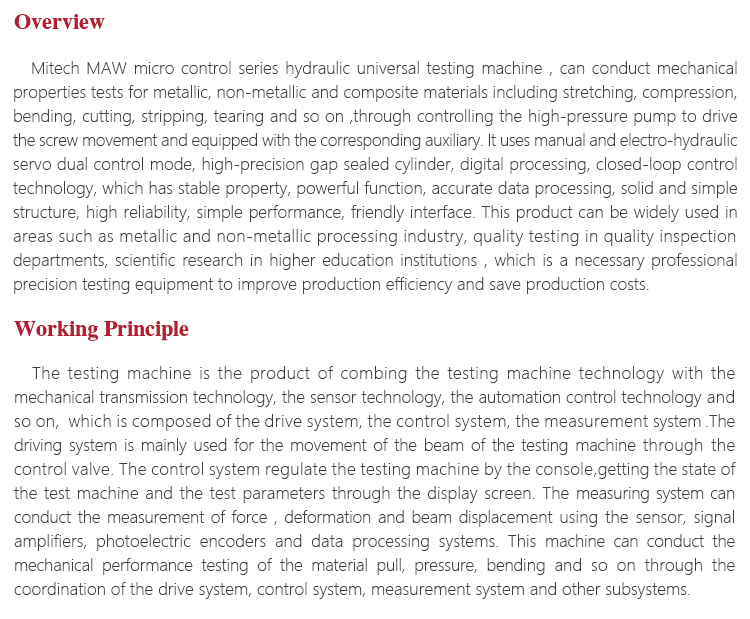 Mitech MAW micro control series hydraulic universal testing machine , can conduct mechanical properties tests for metallic, non-metallic and composite materials including stretching, compression, bending, cutting, stripping, tearing and so on ,through controlling the high-pressure pump to drive the screw movement and equipped with the corresponding auxiliary. It uses manual and electro-hydraulic servo dual control mode, high-precision gap sealed cylinder, digital processing, closed-loop control technology, which has stable property, powerful function, accurate data processing, solid and simple structure, high reliability, simple performance, friendly interface. This product can be widely used in areas such as metallic and non-metallic processing industry, quality testing in quality inspection departments, scientific research in higher education institutions , which is a necessary professional precision testing equipment to improve production efficiency and save production costs.