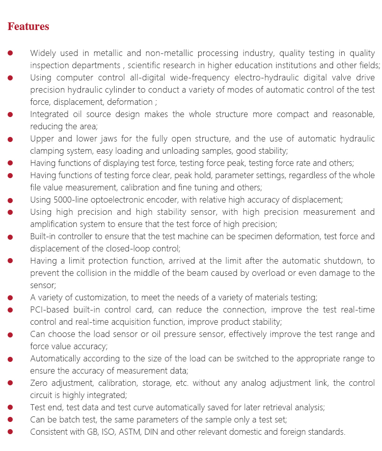 l Using computer control all-digital wide-frequency electro-hydraulic digital valve drive precision hydraulic cylinder to conduct a variety of modes of automatic control of the test force, displacement, deformation ;