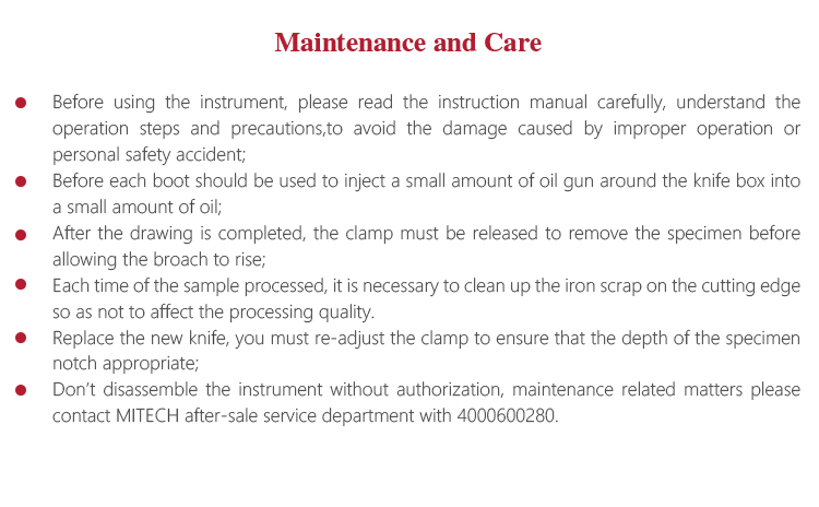 l Each time of the sample processed, it is necessary to clean up the iron scrap on the cutting edge so as not to affect the
