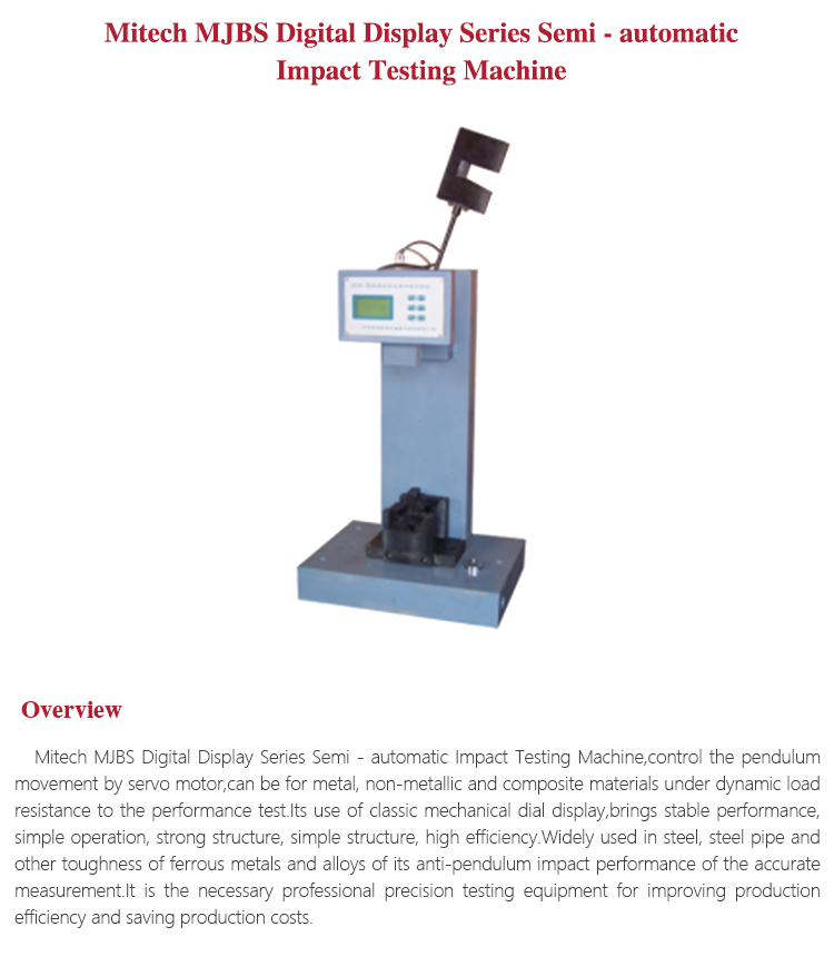 Product OverviewMitech MJBS Digital Display Series Semi - automatic Impact Testing Machine,control the pendulum movement by servo motor,can be for metal, non-metallic and composite materials under dynamic load resistance to the performance test.Its use of classic mechanical dial display,brings stable performance, simple operation, strong structure, simple structure, high efficiency.Widely used in steel, steel pipe and other toughness of ferrous metals and alloys of its anti-pendulum impact performance of the accurate measurement.It is the necessary professional precision testing equipment for improving production efficiency and saving production costs.