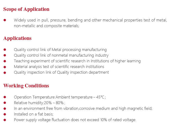 Product OverviewMitech MAW micro control series hydraulic universal testing machine , can conduct mechanical properties tests for metallic, non-metallic and composite materials including stretching, compression, bending, cutting, stripping, tearing and so on ,through controlling the high-pressure pump to drive the screw movement and equipped with the corresponding auxiliary. It uses manual and electro-hydraulic servo dual control mode, high-precision gap sealed cylinder, digital processing, closed-loop control technology, which has stable property, powerful function, accurate data processing, solid and simple structure, high reliability, simple performance, friendly interface. This product can be widely used in areas such as metallic and non-metallic processing industry, quality testing in quality inspection departments, scientific research in higher education institutions , which is a necessary professional precision testing equipment to improve production efficiency and save production costs