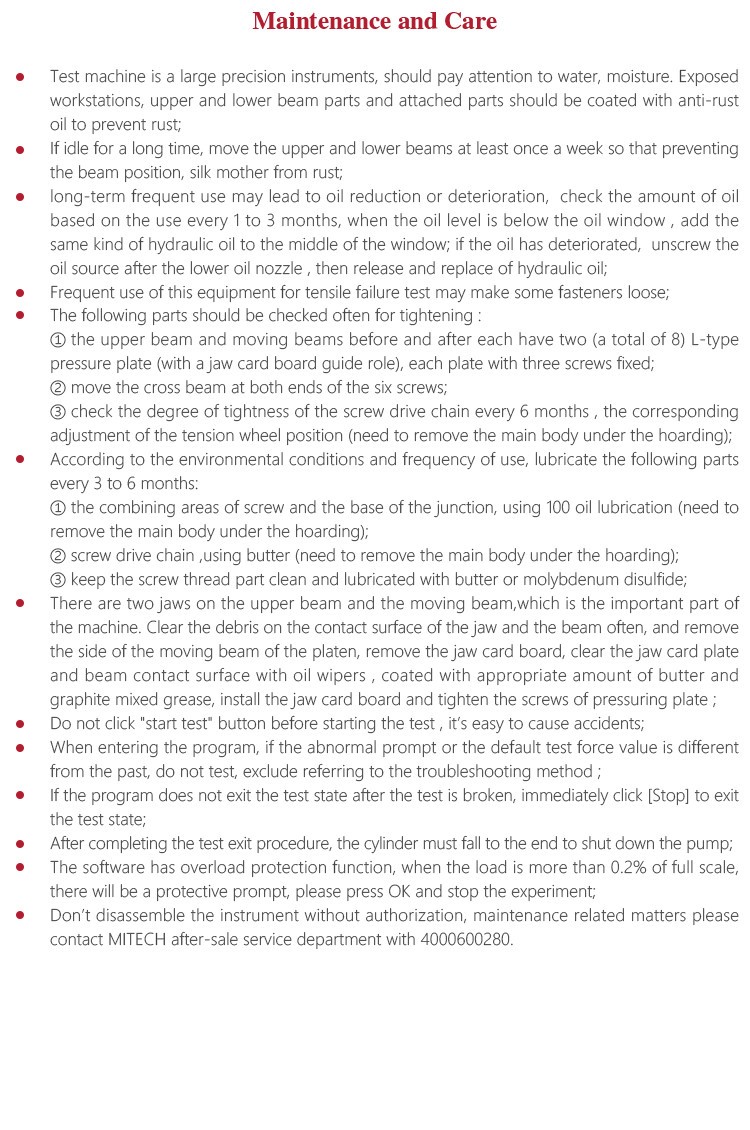 <!--[if !supportLists]--> l <!--[endif]-->Test machine is a large precision instruments, should pay attention to water, moisture. Exposed workstations, upper and lower beam parts and attached parts should be coated with anti-rust oil to prevent rust;