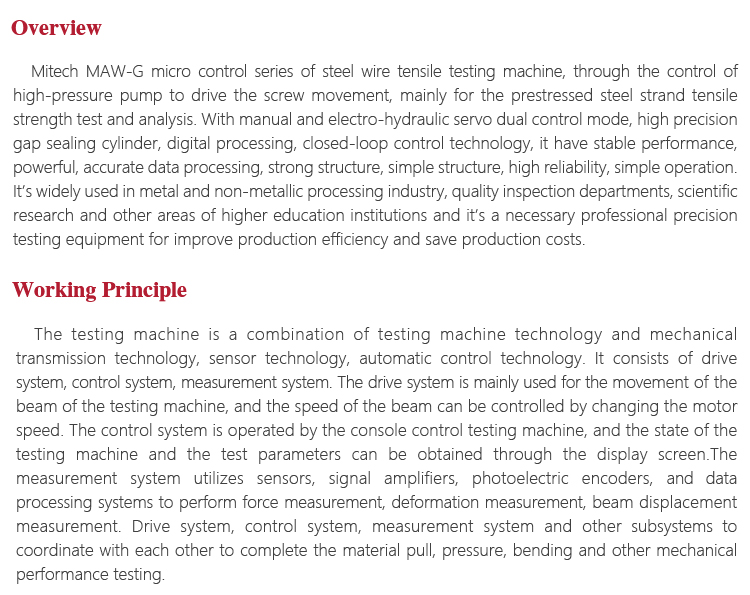 Mitech MAW-G micro control series of steel wire tensile testing machine, through the control of high-pressure pump to drive the screw movement, mainly for the prestressed steel strand tensile strength test and analysis. With manual and electro-hydraulic servo dual control mode, high precision gap sealing cylinder, digital processing, closed-loop control technology, it have stable performance, powerful, accurate data processing, strong structure, simple structure, high reliability, simple operation. It’s widely used in metal and non-metallic processing industry, quality inspection departments, scientific research and other areas of higher education institutions and it’s a necessary professional precision testing equipment for improve production efficiency and save production costs.