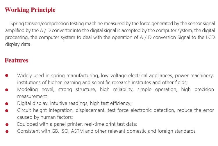 Working PrincipleSpring tension/compression testing machine measured by the force generated by the sensor signal amplified by the A / D converter into the digital signal is accepted by the computer system, the digital processing, the computer system to deal with the operation of A / D conversion Signal to the LCD display data.