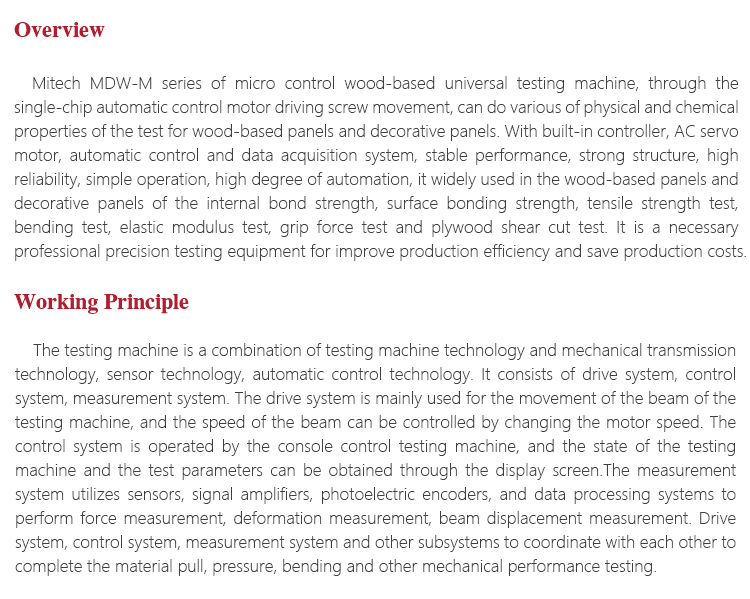 Product OverviewMitech MDW-M series of micro control wood-based universal testing machine, through the single-chip automatic control motor driving screw movement, can do various of physical and chemical properties of the test for wood-based panels and decorative panels. With built-in controller, AC servo motor, automatic control and data acquisition system, stable performance, strong structure, high reliability, simple operation, high degree of automation, it widely used in the wood-based panels and decorative panels of the internal bond strength, surface bonding strength, tensile strength test, bending test, elastic modulus test, grip force test and plywood shear cut test. It is a necessary professional precision testing equipment for improve production efficiency and save production costs.