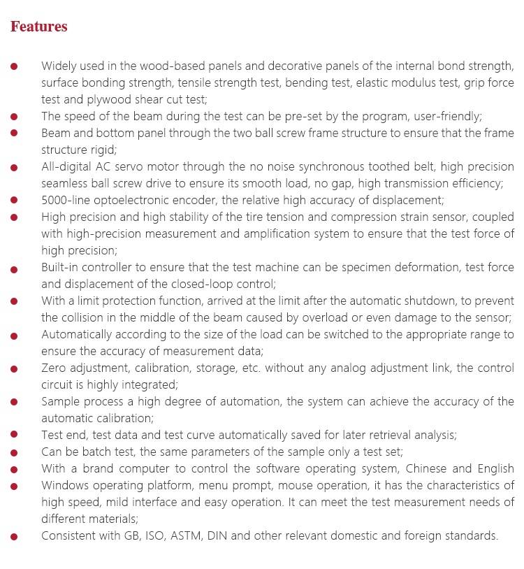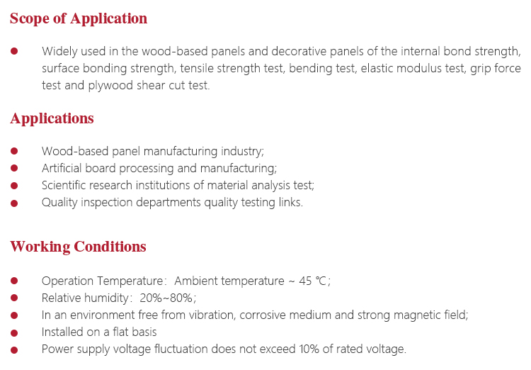 Instrument Featuresl Widely used in the wood-based panels and decorative panels of the internal bond strength, surface bonding strength, tensile strength test, bending test, elastic modulus test, grip force test and plywood shear cut test;