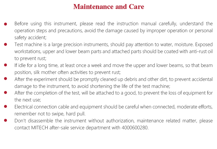 l Test machine is a large precision instruments, should pay attention to water, moisture. Exposed workstations, upper and lower beam parts and attached parts should be coated with anti-rust oil to prevent rust;