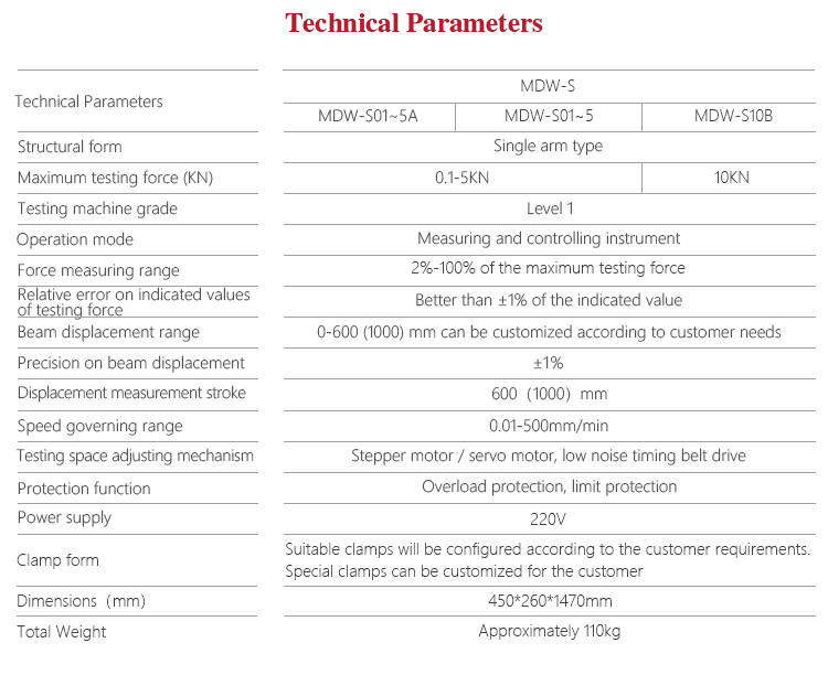 Mitech MDW-S digital display series single arm type electronic universal testing machine,through the single-chip automatic control motor driving screw movement, equipped with the corresponding auxiliary for metal, non-metallic and composite materials for pull, pressure, bending and other mechanical properties test.( The tensile test is carried out between the upper beam of the main body and the moving beam, and the compression and bending tests are carried out between the main plate and the moving beam. ),it use of built-in controller, AC servo motor, automatic control and data acquisition system, stable performance, strong structure, high reliability, simple operation, high degree of automation. Widely used in metal and non-metallic processing industry, quality inspection departments quality testing, scientific research and other areas of higher education institutions, is to improve production efficiency and save production costs necessary professional precision testing equipment.