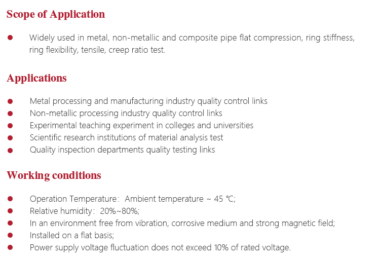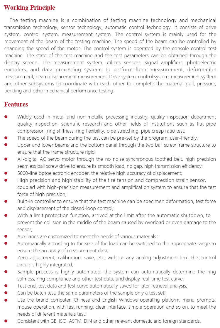 Widely used in metal, non-metallic and composite pipe flat compression, ring stiffness, ring flexibility, tensile, creep ratio test.