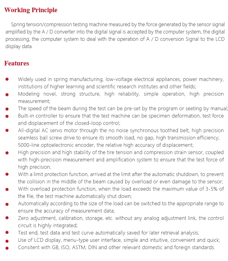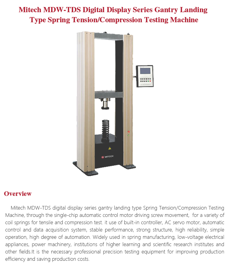 Mitech MDW-TDS digital series of Single - Arm Spring Tension/Compression Testing Machine, through the single-chip automatic control motor driving screw movement, for a variety of coil springs for tensile and compression test. it use of built-in controller, AC servo motor, automatic control and data acquisition system, stable performance, strong structure, high reliability, simple operation, high degree of automation. Widely used in spring manufacturing, low-voltage electrical appliances, power machinery, institutions of higher learning and scientific research institutes and other fields.It is the necessary professional precision testing equipment for improving production efficiency and saving production costs.