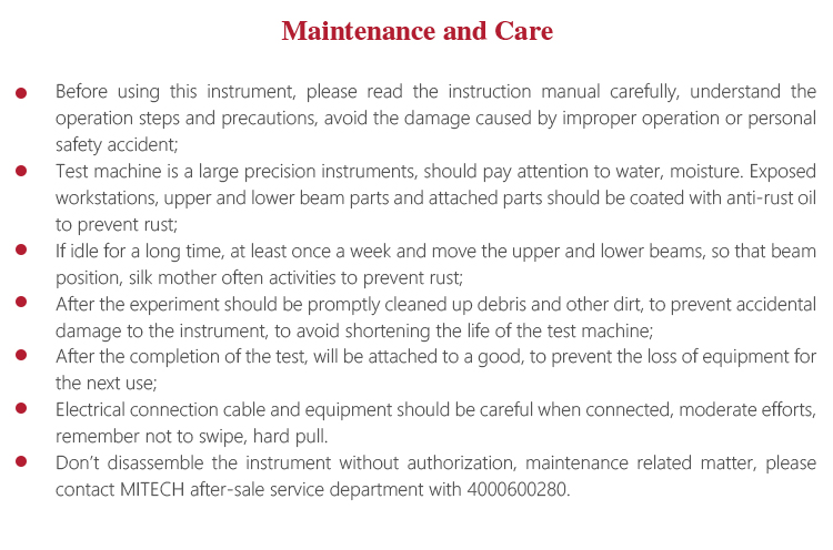 l Test machine is a large precision instruments, should pay attention to water, moisture. Exposed workstations, upper and lower beam parts and attached parts should be coated with anti-rust oil to prevent rust;