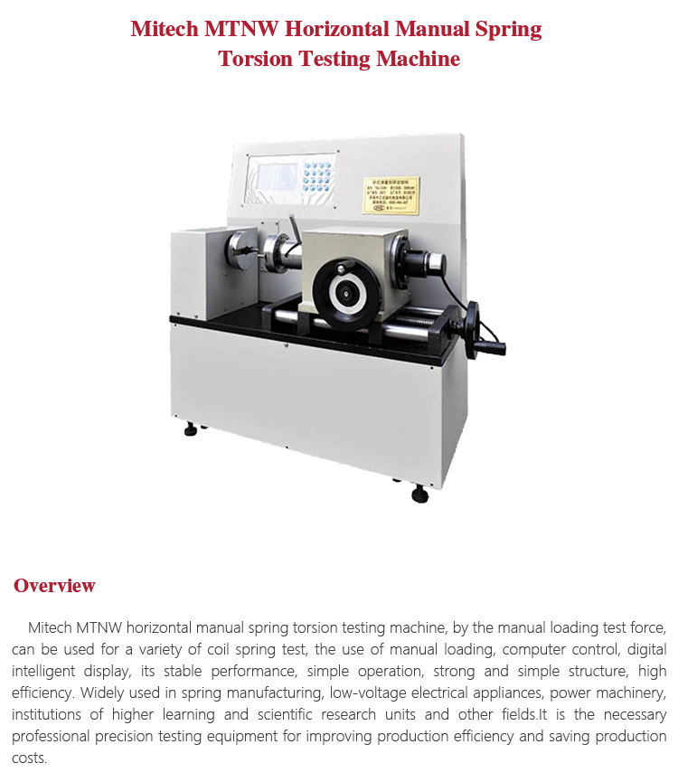 Mitech MTNW horizontal manual spring torsion testing machine, by the manual loading test force, can be used for a variety of coil spring test, the use of manual loading, computer control, digital intelligent display, its stable performance, simple operation, strong and simple structure, high efficiency. Widely used in spring manufacturing, low-voltage electrical appliances, power machinery, institutions of higher learning and scientific research units and other fields.It is the necessary professional precision testing equipment for improving production efficiency and saving production costs.