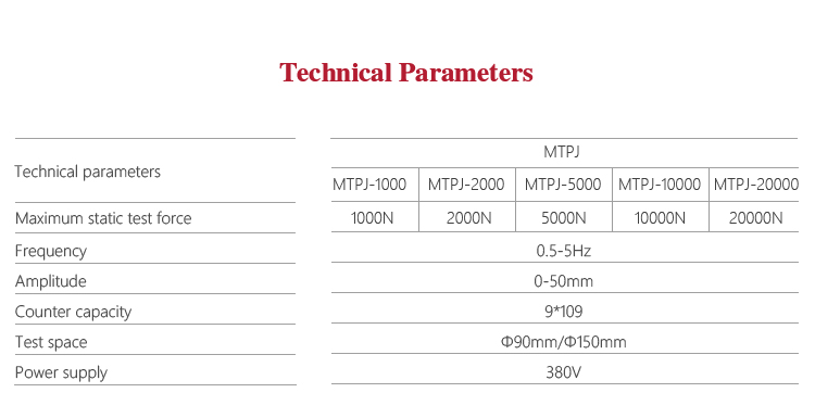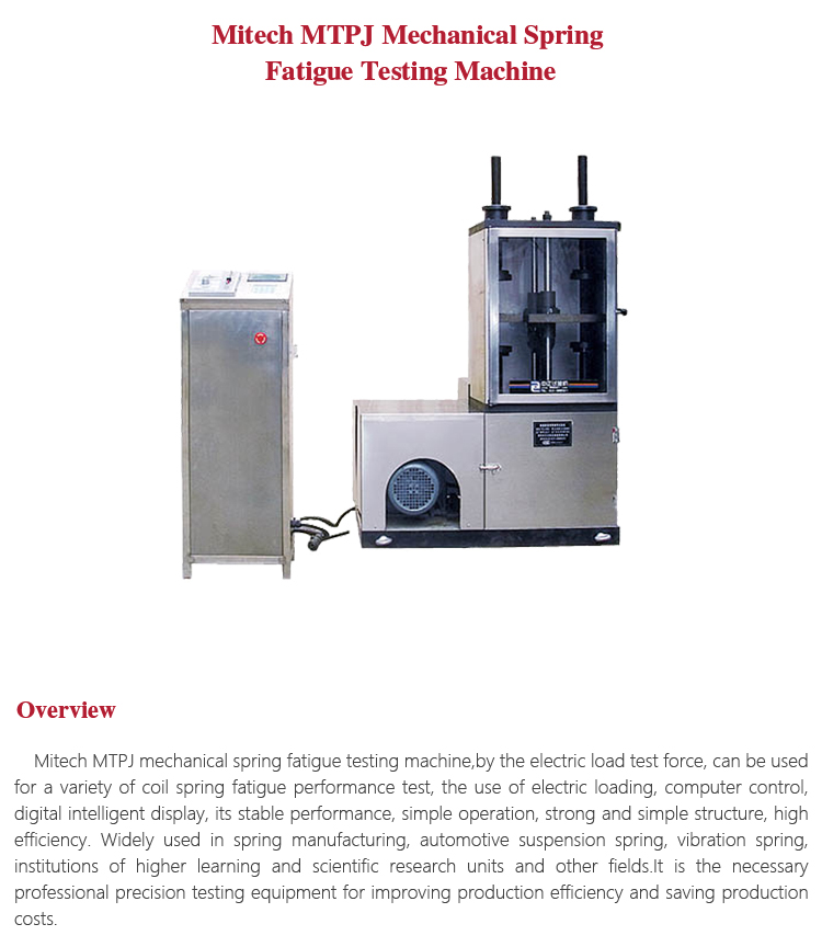 Product OverviewMitech MTPJ mechanical spring fatigue testing machine,by the electric load test force, can be used for a variety of coil spring fatigue performance test, the use of electric loading, computer control, digital intelligent display, its stable performance, simple operation, strong and simple structure, high efficiency. Widely used in spring manufacturing, automotive suspension spring, vibration spring, institutions of higher learning and scientific research units and other fields.It is the necessary professional precision testing equipment for improving production efficiency and saving production costs.