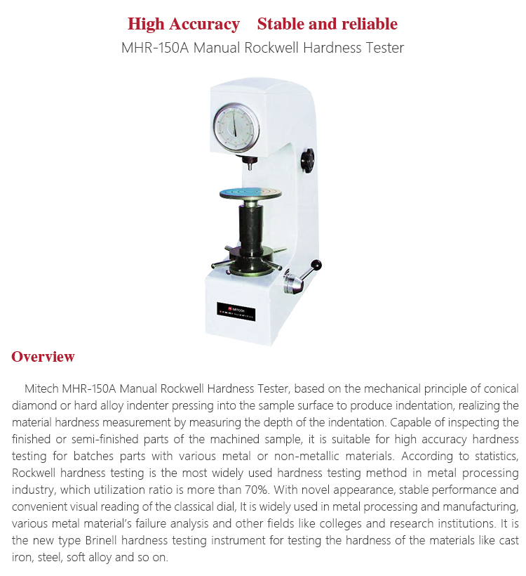 Mitech MHR-150A Manual Rockwell Hardness Tester, based on the mechanical principle of conical diamond or hard alloy indenter pressing into the sample surface to produce indentation, realizing the material hardness measurement by measuring the depth of the indentation. Capable of inspecting the finished or semi-finished parts of the machined sample, it is suitable for high accuracy hardness testing for batches parts with various metal or non-metallic materials. According to statistics, Rockwell hardness testing is the most widely used hardness testing method in metal processing industry, which utilization ratio is more than 70%. With novel appearance, stable performance and convenient visual reading of the classical dial, It is widely used in metal processing and manufacturing, various metal material’s failure analysis and other fields like colleges and research institutions. It is the new type Brinell hardness testing instrument for testing the hardness of the materials like cast iron, steel, soft alloy and so on.