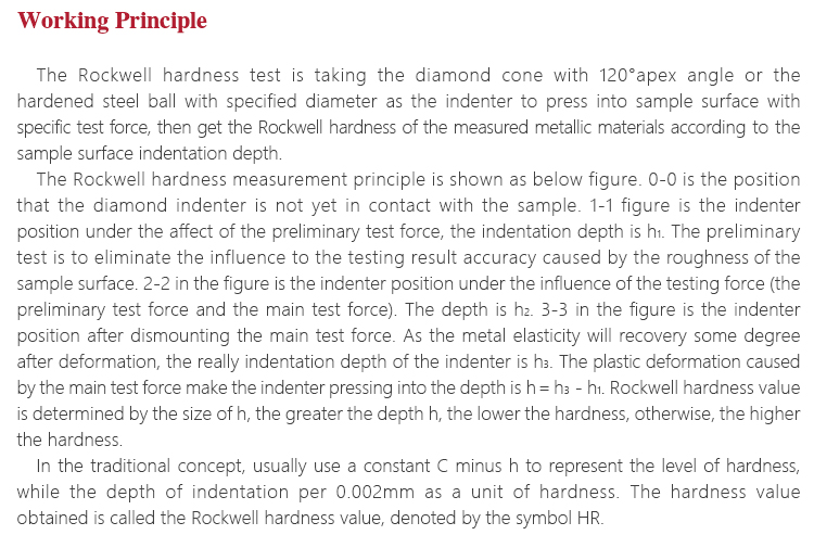 The Rockwell hardness measurement principle is shown as below figure. 0-0 is the position that the diamond indenter is not yet in contact with the sample. 1-1 figure is the indenter position under the affect of the preliminary test force, the indentation depth is h1. The preliminary test is to eliminate the influence to the testing result accuracy caused by the roughness of the sample surface. 2-2 in the figure is the indenter position under the influence of the testing force (the preliminary test force and the main test force). The depth is h2. 3-3 in the figure is the indenter position after dismounting the main test force. As the metal elasticity will recovery some degree after deformation, the really indentation depth of the indenter is h3. The plastic deformation caused by the main test force make the indenter pressing into the depth is hh3h1. Rockwell hardness value is determined by the size of h, the greater the depth h, the lower the hardness, otherwise, the higher the hardness.