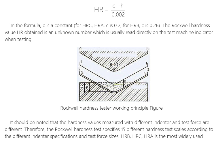 In the formula, c is a constant (for HRC, HRA, c is 0.2; for HRB, c is 0.26). The Rockwell hardness value HR obtained is an unknown number which is usually read directly on the test machine indicator when testing.
