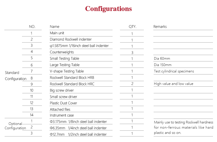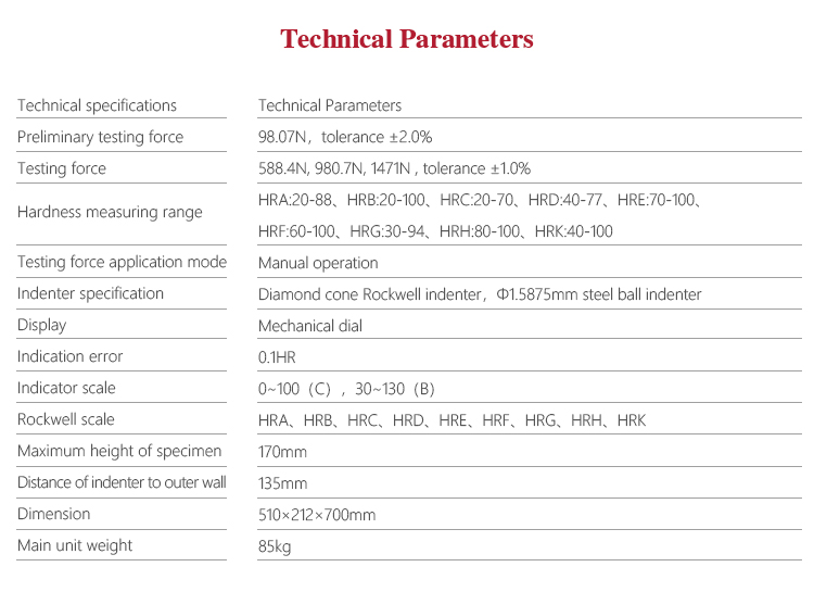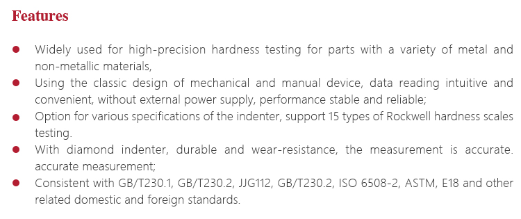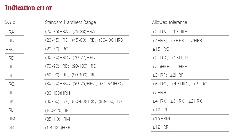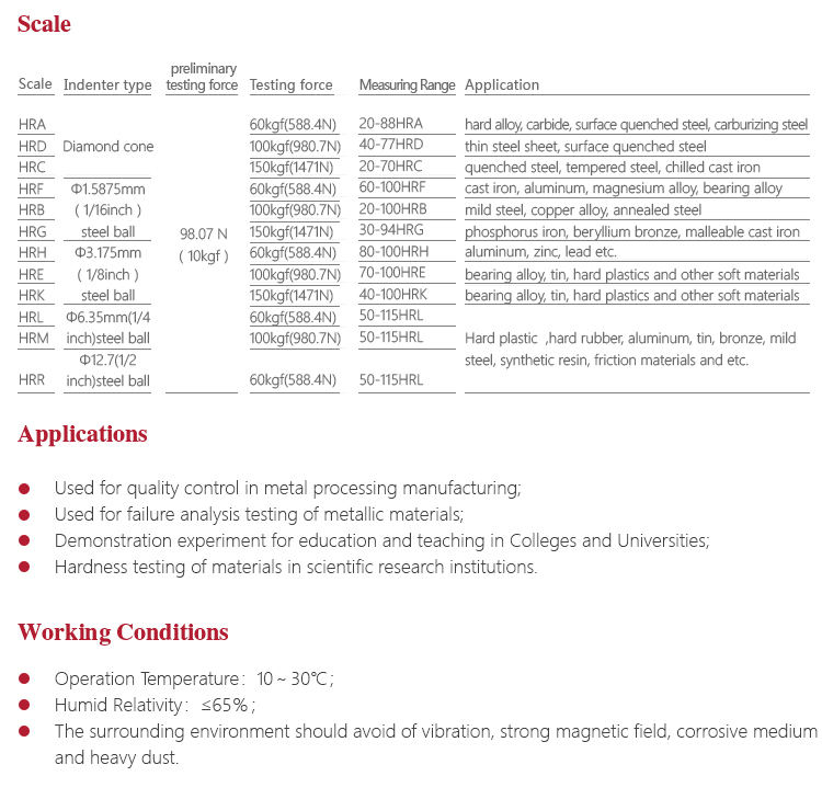 Hardness Measuring range HRA:20-88、HRB:20-100、HRC:20-70、HRD:40-77、HRE:70-100、 HRF:60-100、HRG:30-94、HRH:80-100、HRK:40-100