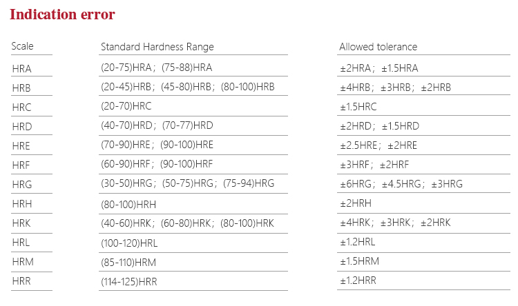 | Measuring range | HRA:20-96、 HRB:20-100、HRC:20-70、 HRD:40-77、 HRE:70-100、HRF:60-100 HRG:30-94、 HRH:80-100、HRK:40-100、 |