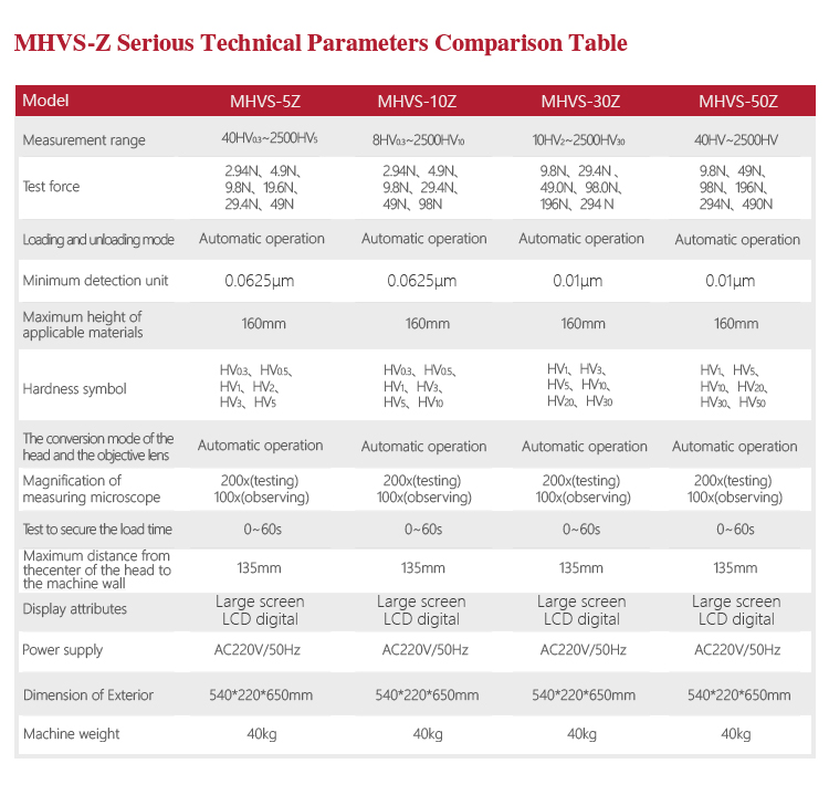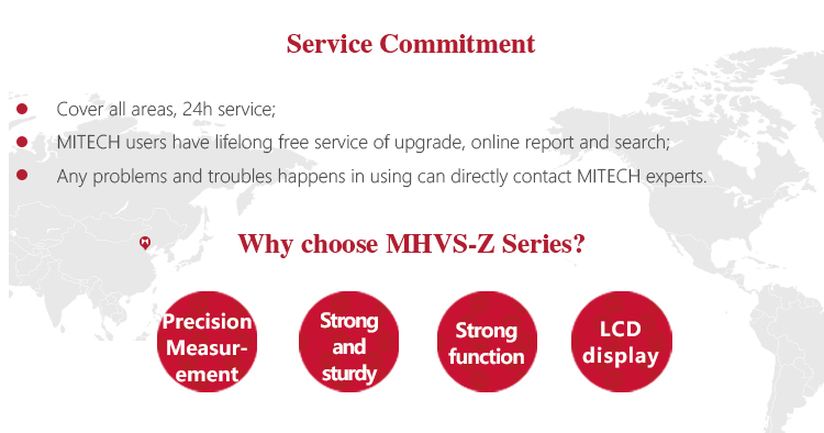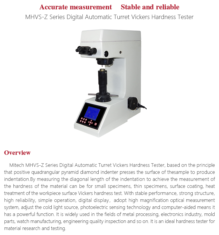 Product OverviewMitech MHVS-Z Series Digital Automatic Turret Vickers Hardness Tester, based on the principle that positive quadrangular pyramid diamond indenter presses the surface of thesample to produce indentation.By measuring the diagonal length of the indentation to achieve the measurement of the hardness of the material can be for small specimens, thin specimens, surface coating, heat treatment of the workpiece surface Vickers hardness test. With stable performance, strong structure, high reliability, simple operation, digital display,adopt high magnification optical measurement system, adjust the cold light source, photoelectric sensing technology and computer-aided means it has a powerful function. It is widely used in the fields of metal processing, electronics industry, mold parts, watch manufacturing, engineering quality inspection and so on. It is an ideal hardness tester for material research and testing.