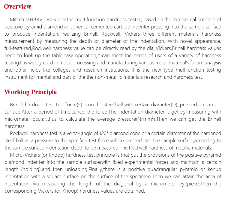 Product OverviewMitech MHBRV-187.5 electric multifunctional hardness tester, based on the mechanical principle of positive pyramid diamond or spherical cemented carbide indenter pressing into the sample surface to produce indentation, realizing Brinell, Rockwell, Vickers three different materials hardness measurement by measuring the depth or diameter of the indentation. With novel appearance, full-featured, Rockwell hardness value can be directly read by the dial, Vickers, Brinell hardness values need to look up the table, easy operation, it can meet the needs of users of a variety of hardness testing. It is widely used in metal processing and manufacturing, various metal material’s failure analysis and other fields like colleges and research institutions. It is the new type multifunctional testing instrument for mental and part of the the non-metallic materials research and hardness test.