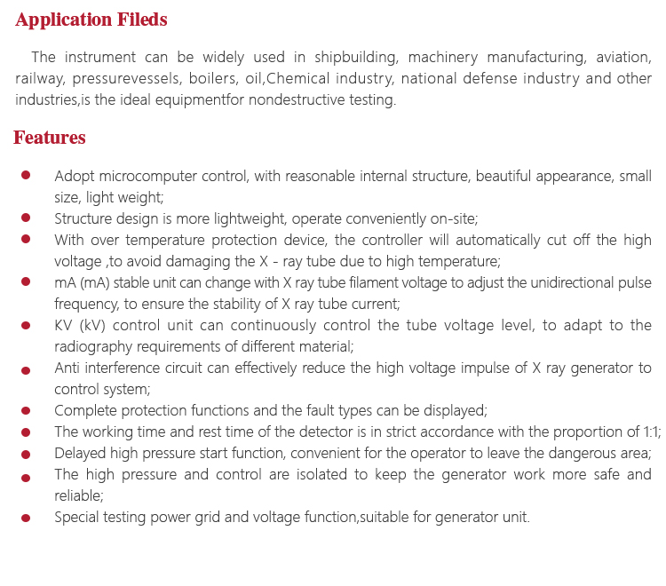 When using this generator there should be x radiation protection facilities. For example, using 2mm thick tinplate forprotection. If there is no protection measurement, we should take X ray generator as the center, keep no one in the field within a radius of 20 meters. Meet the safety requirements before radiographic.