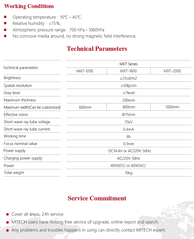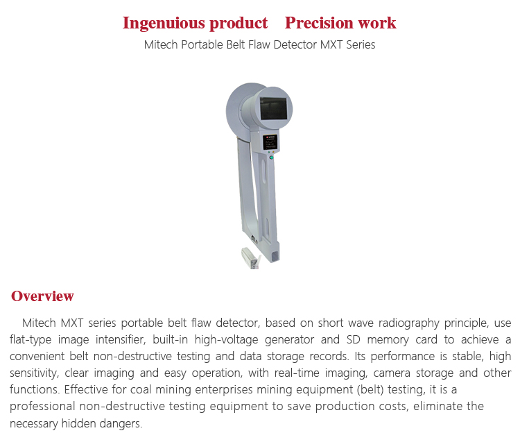 Mitech MXT series portable belt flaw detector, based on short wave radiography principle, use flat-type image intensifier, built-in high-voltage generator and SD memory card to achieve a convenient belt non-destructive testing and data storage records. Its performance is stable, high sensitivity, clear imaging and easy operation, with real-time imaging, camera storage and other functions. Effective for coal mining enterprises mining equipment (belt) testing, it is a professional non-destructive testing equipment to save production costs, eliminate the necessary hidden dangers