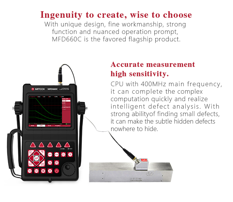 Product OverviewMFD660C intelligent digital ultrasonic flaw detector, Mitech concentrated years meticulously developed premium product, has a lot of advantages like unique design, sophisticated manufacturing, convenient operation, powerful function. It had received customers' favored since its inception. It can test, orient, evaluate and diagnose various flaws such as crack, lard, air hole in workpiece’s interior swiftly and accurately without any destruction. With full digital 640X480 TFT LCD display, it can select the operating interface style and the LCD brightness according to environment. With humanizing interface design, the waveform show delicately. It can find the defects clearly in full screen. Single hand capable for holding operation, the curve making, probe calibration and other conventional operation can be completed automatically. Core processor CPU with 400M main frequency, it can complete the complex run quickly and realize intelligent defect analysis. Low power design with large capacity and high performance lithium ion battery module, it can work more than 10 hours continuously. Full English master-slave menu, emphasizing on user experience, collecting shortcut keys, digital shuttle rotary wheel, cross menu three operating ways in one body, customers with different habits can operate it freely. It supports many languages. Its waterproof, oil proof, dustproof function can achieve IP65 protection level. It is the necessary professional precision instrument for defect detection, quality control, on-line safety monitoring and life evaluation in fields of oil, chemical, metallurgy, shipbuilding, aviation, railways and so on.