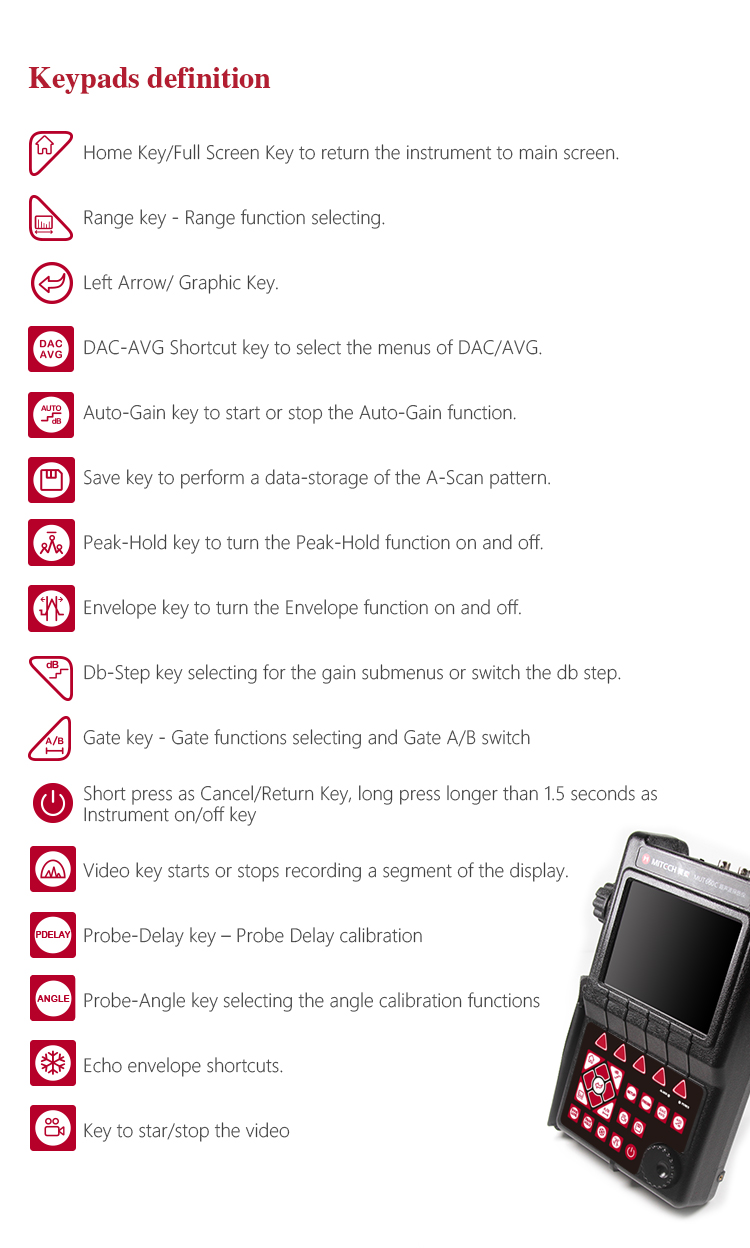 Instrument FeaturesGate position, gate width and gate height can be adjustable at will. The B gate can chose to set wave-getting alarm OR wave-losing alarm. The beep in gate and LED light can be alarmed or closed (the LED light alarm is very effective under the noise environment). The capture mark function can show the captured echo characteristics in the gate.