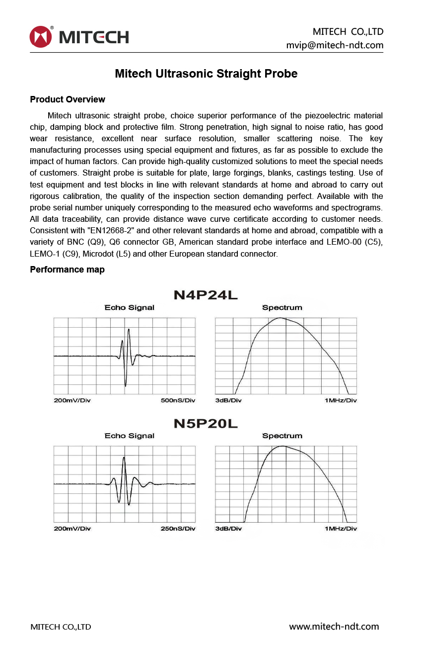 Product OverviewMitech ultrasonic straight probe, choice superior performance of the piezoelectric material chip, damping block and protective film. Strong penetration, high signal to noise ratio, has good wear resistance, excellent near surface resolution, smaller scattering noise. The key manufacturing processes using special equipment and fixtures, as far as possible to exclude the impact of human factors. Can provide high-quality customized solutions to meet the special needs of customers. Straight probe is suitable for plate, large forgings, blanks, castings testing. Use of test equipment and test blocks in line with relevant standards at home and abroad to carry out rigorous calibration, the quality of the inspection section demanding perfect. Available with the probe serial number uniquely corresponding to the measured echo waveforms and spectrograms. All data traceability, can provide distance wave curve certificate according to customer needs. Consistent with "EN12668-2" and other relevant standards at home and abroad, compatible with a variety of BNC (Q9), Q6 connector GB, American standard probe interface and LEMO-00 (C5), LEMO-1 (C9), Microdot (L5) and other European standard connector.