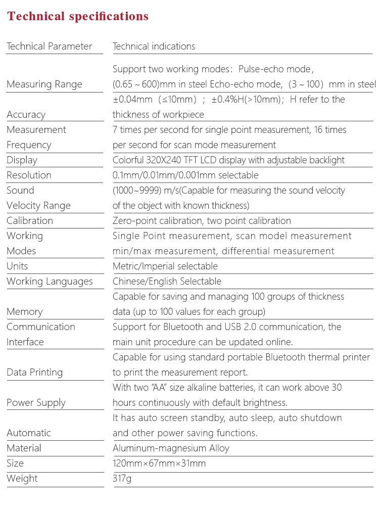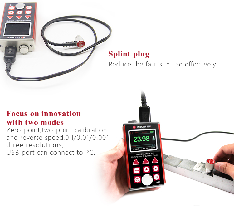 Product OverviewMT660 multi-mode ultrasonic thickness gauge is the newest promoted upgraded product by Mitech. It pays more attention to user experience and functional innovation. Adopted with 320*240 colorful LCD display, it can show you clear measurement result under dim light and strong sunshine environment, improved the visual experience greatly. Sealed aluminum-magnesium alloy case delicate design, smaller volume, better quality are specially designed for defense against oil, dust in the bad sit environment. With intelligent warning function, it will promote automatically when beyond the setting range, it is convenient for reading. It can meet the efficient collecting material’s multiple points’ thickness accurate testing demand. It supports 0.001 high accuracy display and Bluetooth communication. With through coating mode and common mode, its unique performance of capable for testing thickness through the coating provides efficient solution for testing the workpiece of coated surface or corrosion materials. It can measure the workpiece directly without needing to get rid of the surface coating before measurement. It’s widely used for monitoring the production equipments’ various pipelines and pressure vessel corrosion reducing degree in the fields of petroleum, chemical, metallurgy, shipbuilding, aviation, aerospace and so on. It also can be used for making accurate measurement to various plates and machining parts. It is the necessary professional precision instrument for improving the production efficiency and qualification rate as well as saving cost.
