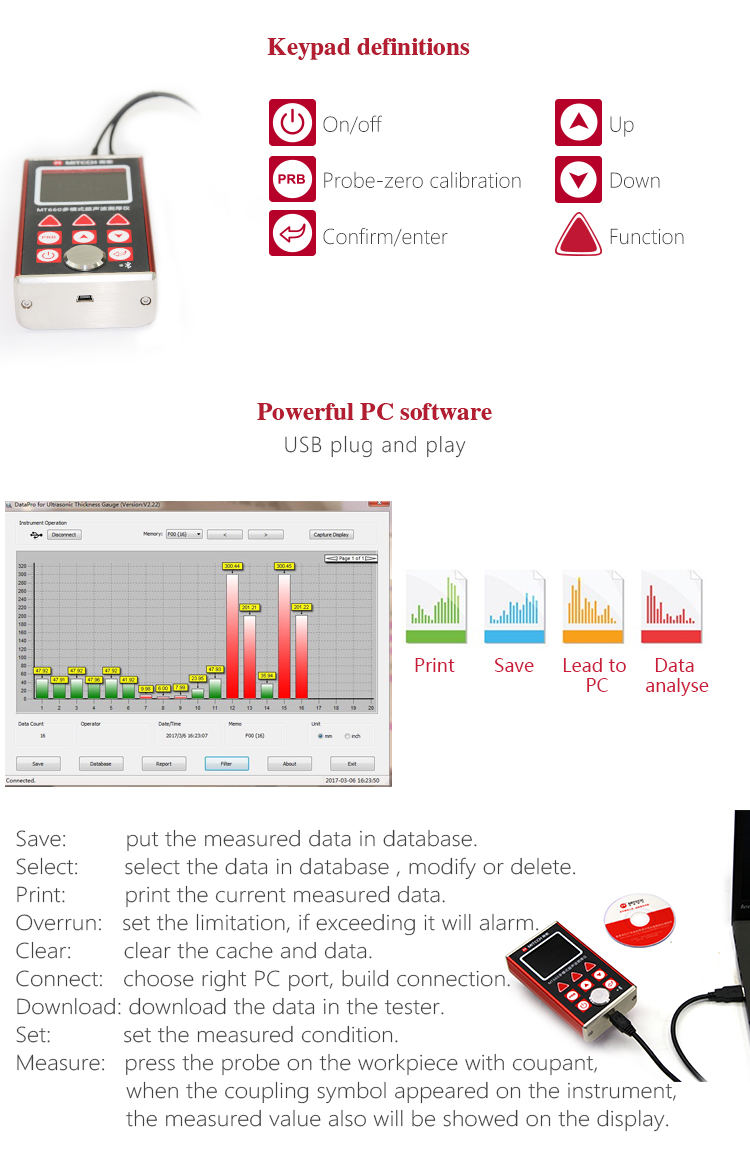 The data proceeding software for ultrasonic thickness gauge, the standard configuration for MT600/MT660, it can be easily and quickly do data exchange and parameter settings with PC. It has rich features like measurement storage management, statistical analysis of measured value, printing measurement report and so on. It is suitable for steel manufacturing, ship-building, automobile manufacturing, aircraft manufacturing, high pressure vessels, electric devices, bearings, standard parts, metal textile accessories and instrumentation accessories and production enterprises related with metal material products. With the analysis results provided by the software, it can make enterprise quality control more scientific basis and higher traceability. Improving the quality of enterprise information management level is the effectively guarantee for enterprise analysis the product qualification rate and improve the quality monitor. The software can also be used as effective tools in scientific research units related with metal materials, manufacturing plants, universities and other departments engaged in theoretical teaching, experimental analysis and basic scientific research.