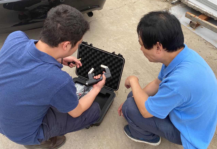 在車間,教授為我們講解了高鐵車廂的結(jié)構(gòu)構(gòu)成,和工件的整體結(jié)構(gòu)構(gòu)成及工作承重環(huán)境。了解了工件的大體結(jié)構(gòu)后,美泰工程師首先使用美泰超聲波測厚儀和涂層測厚儀對工件板材、管件厚度及表面涂層厚度基本參數(shù)進行測量,而后使用美泰超聲波探傷儀對待檢焊縫進行實地探傷試驗。