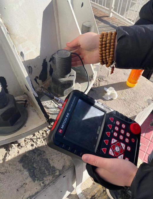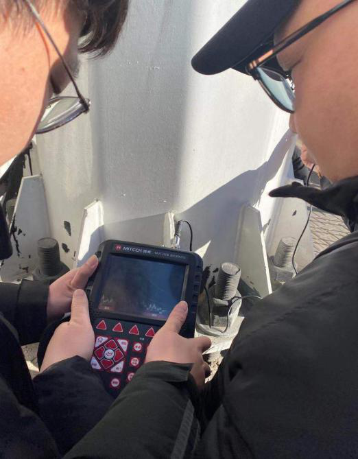 美泰工程師先使用超聲波探傷儀進(jìn)行內(nèi)部缺陷檢測(cè),當(dāng)天現(xiàn)場(chǎng)溫度較低,達(dá)到零下17℃,事先準(zhǔn)備的耦合劑洗滌精,在使用過(guò)程中,短短幾秒就被凍結(jié),現(xiàn)場(chǎng)人員又購(gòu)買(mǎi)了食用油用作耦合。雖然現(xiàn)場(chǎng)溫度較低,但是在更換耦合劑之后,檢測(cè)效果別沒(méi)有受到影響,儀器波形顯示靈敏且清晰。現(xiàn)場(chǎng)檢測(cè)效果十分理想,美泰科儀高智能超聲波探傷儀MUT550B在北方極冷惡劣情況下無(wú)任何不良反應(yīng)。