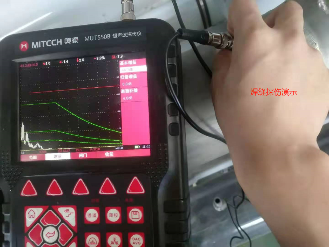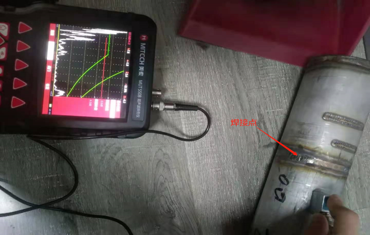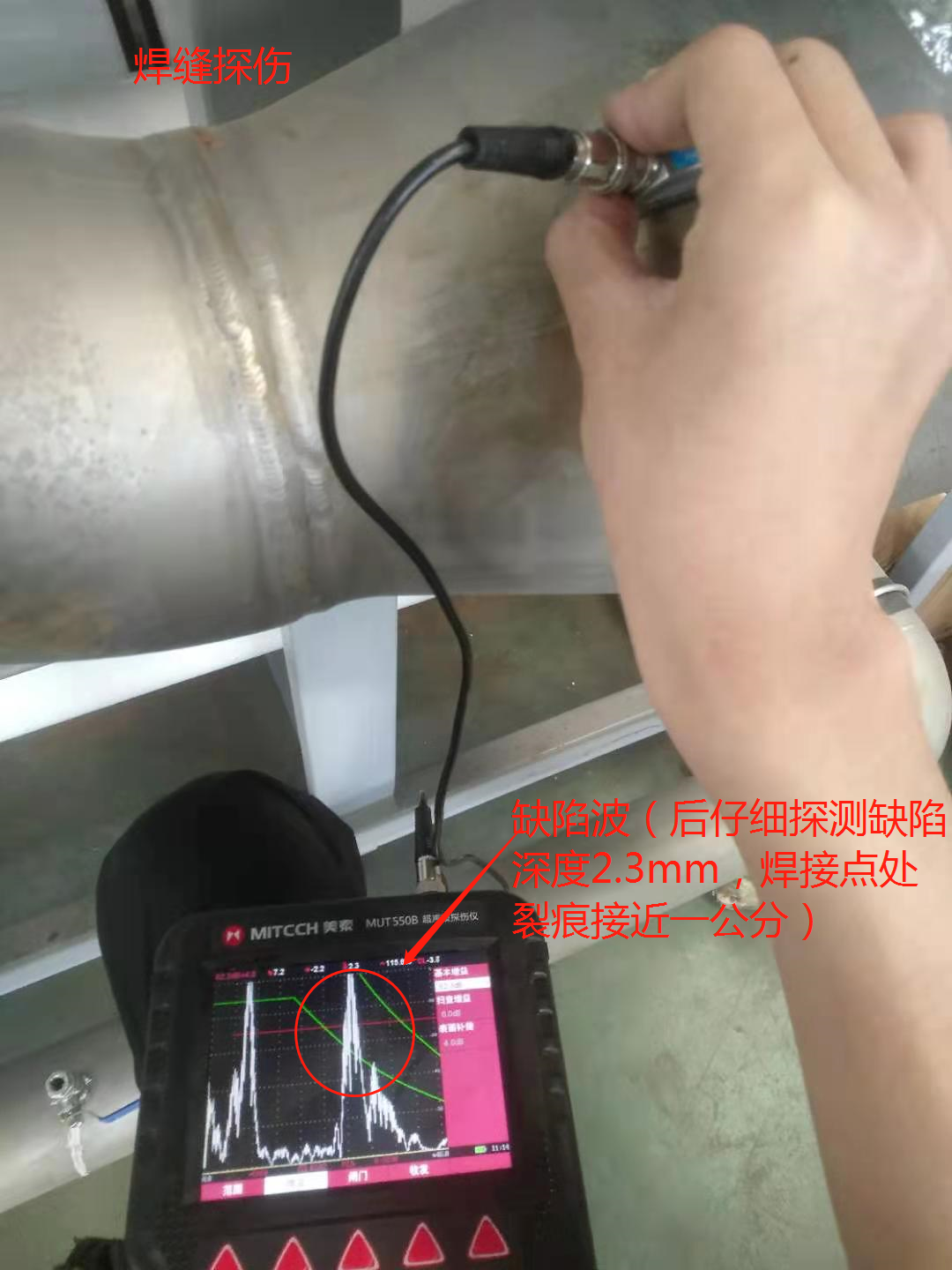 現(xiàn)場了解到,待測工件為4-8mm的管道焊縫,焊接工藝采用的是不銹鋼焊絲焊的氣體保護(hù)焊,主要是對接焊和角焊,現(xiàn)場目視焊縫焊接基本美觀平整。根據(jù)實際情況,美泰工程師選用2.5p 9*9 k3的單晶斜探頭進(jìn)行檢測,對接焊處焊接點(diǎn)可以觀察到明顯的缺陷波。對接焊接管道處進(jìn)行全面掃查探傷后,焊接點(diǎn)缺陷明顯,角焊處角落有小氣泡的存在。