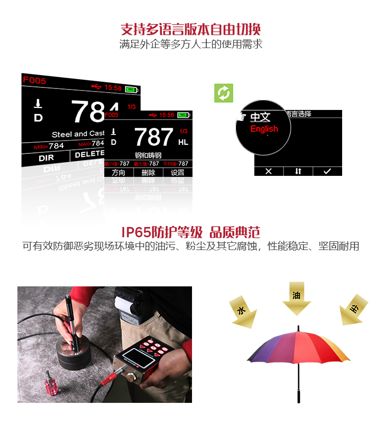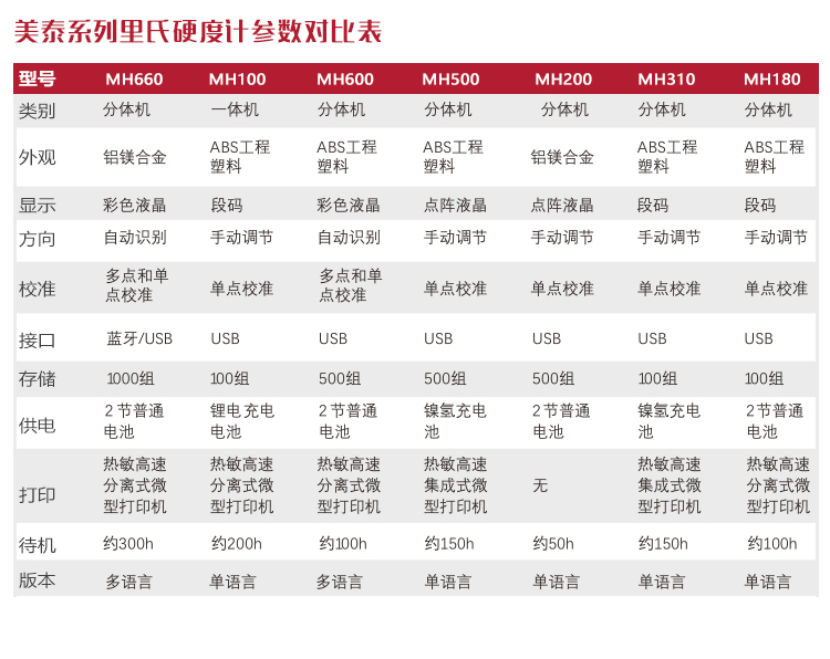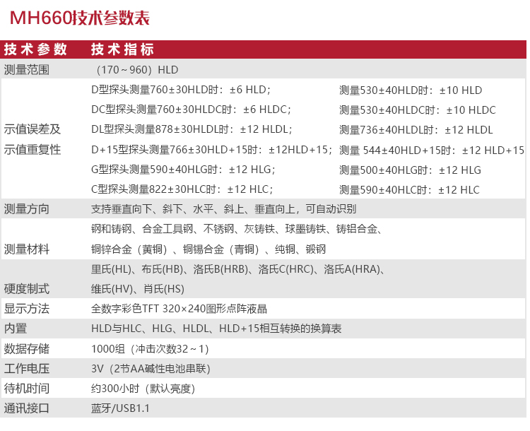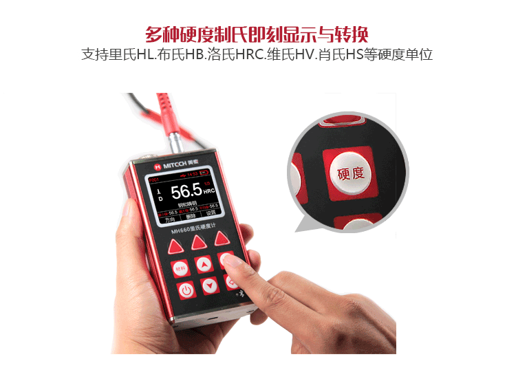 | 單位制式 | 里氏(HL)、布氏(HB)、洛氏B(HRB)、洛氏C(HRC)、洛氏A(HRA)、維氏(HV)、肖氏(HS) |