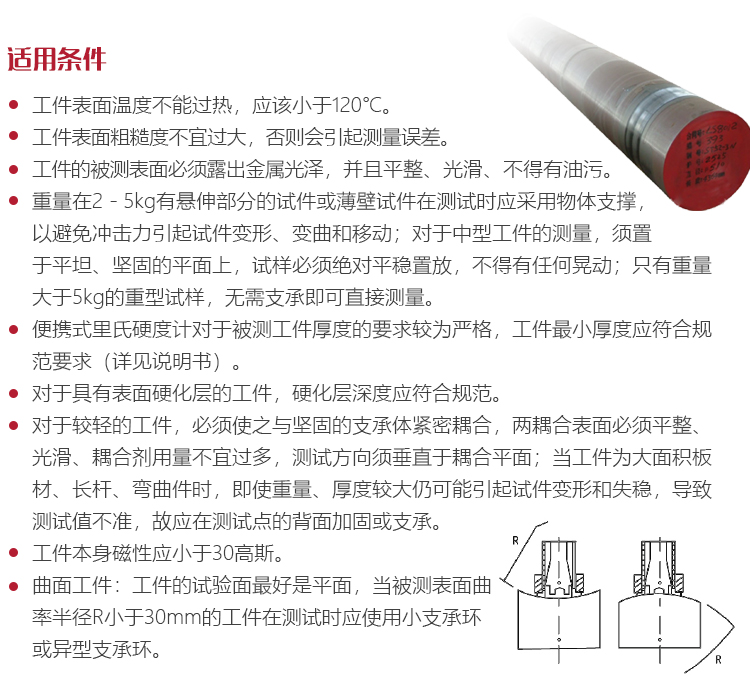 只有重大于5kg的重型試樣,無需支承即可直接測量。便攜式里氏硬度計對于被測工件 厚度的要求較為嚴格,工件最小厚