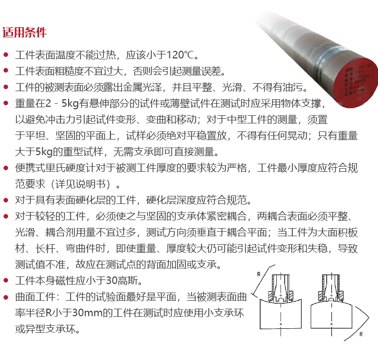 | 美泰便攜式里氏硬度計標(biāo)配小支撐環(huán),用于曲面工件,若被測表面曲面率半徑R小于30mm時,在測試時的應(yīng)使用小支撐環(huán),它能夠使被測工件平穩(wěn),沖擊體和待測工件完全接觸,從而確保所測工件硬度值準(zhǔn)確性。如工件為較特殊的曲面等情況,需選用異型支撐環(huán)。 |